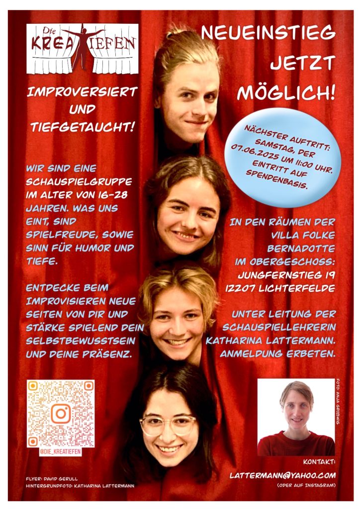 Wir sind eine Gruppe von Jugendlichen im Alter von 14 – 17 Jahren. Unter der professionellen Anleitung einer Schauspielerin / Schauspiellehrerin gestalten wir unseren kreativen Raum flexibel mit